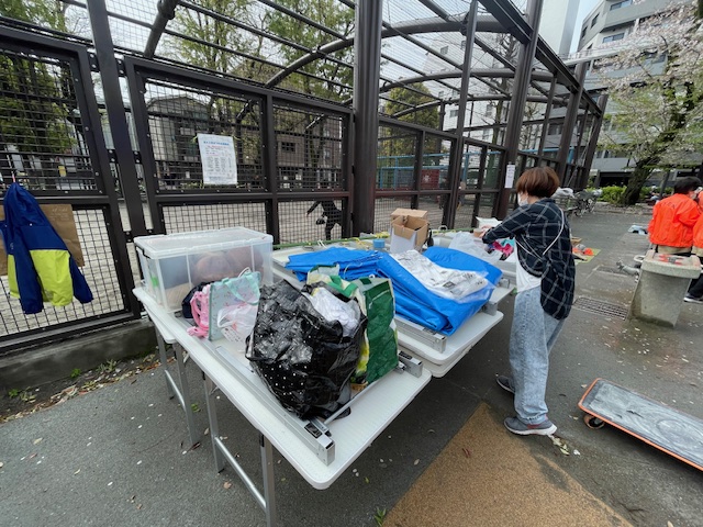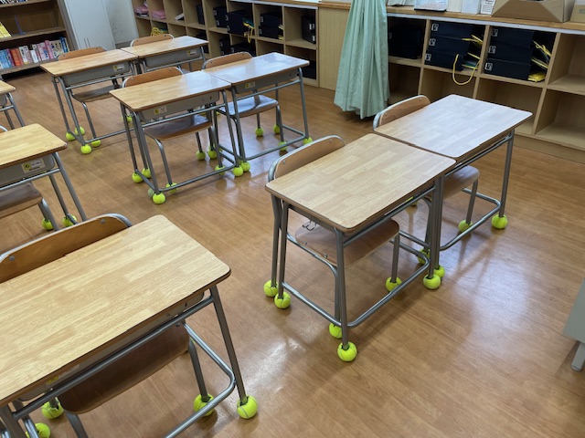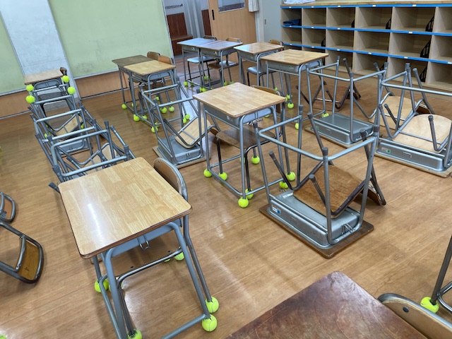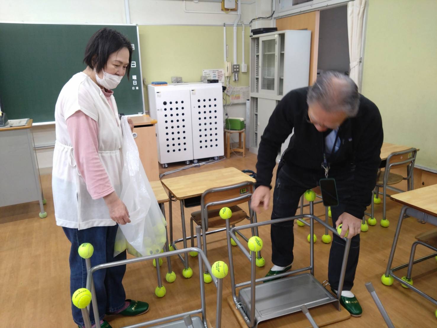 10時00分 林町小学校たいさん木の広場 イス・机のテニスボール取替作業