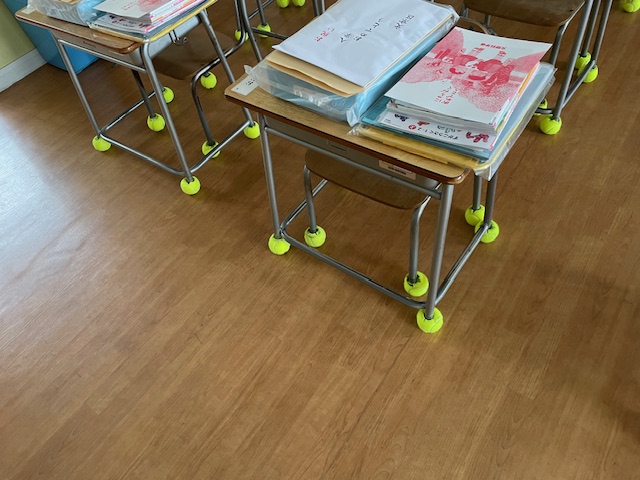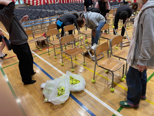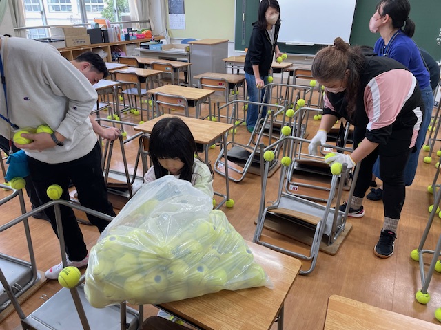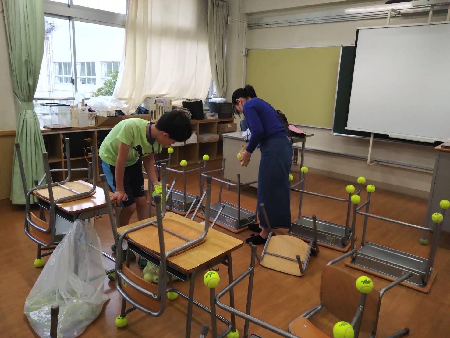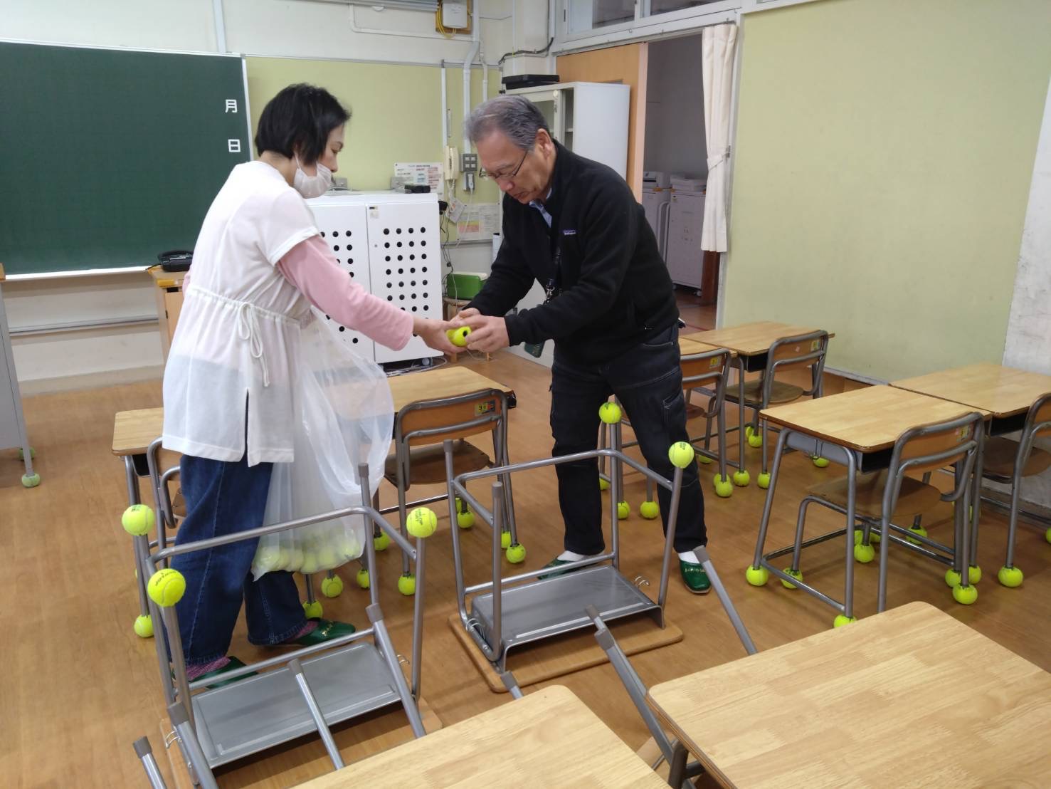 毎年新年度に音の防止の為のテニスボールの取替をしています。今年はPTAの皆さんに手伝ってもらい、短時間で作業を終えることが出来ました。
