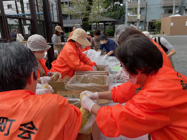 ゆうべの雨の心配をしていましたが、朝には晴れて、無事に運動会が開催出来ます。朝の準備は町会倉庫より、今回使う備品の運び出しからスタートしました。