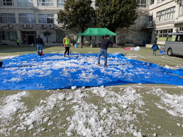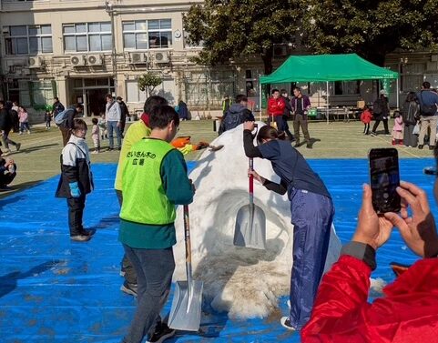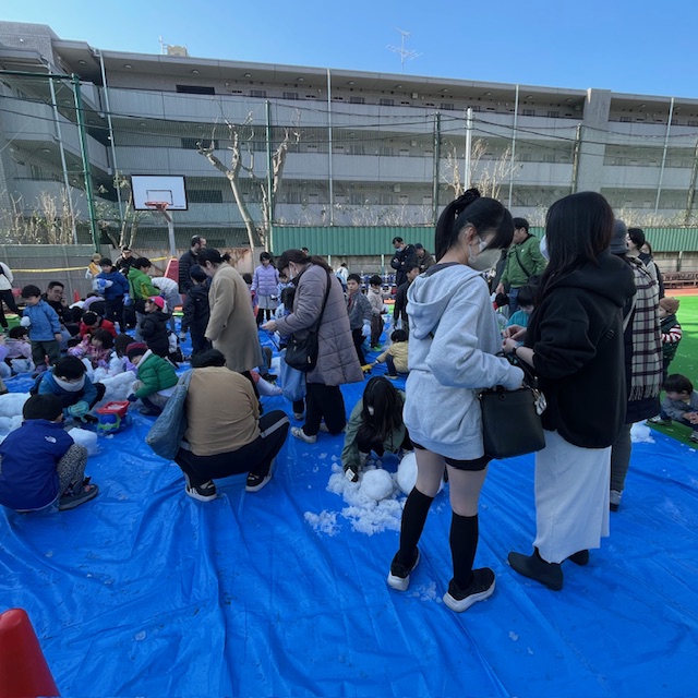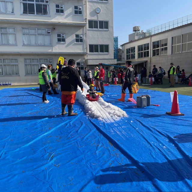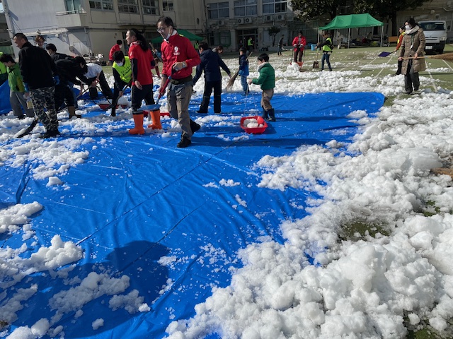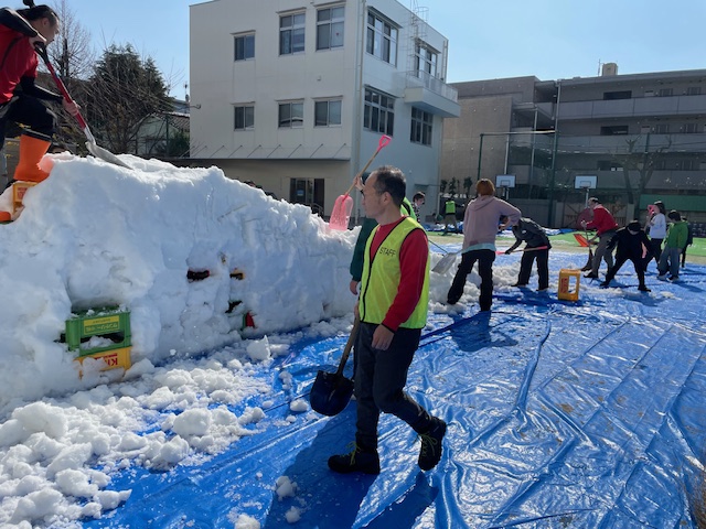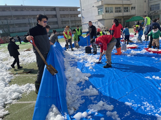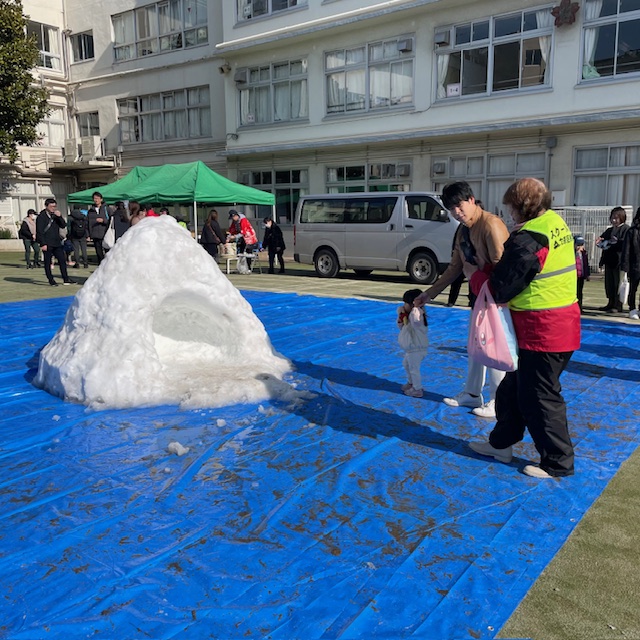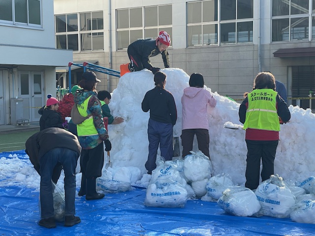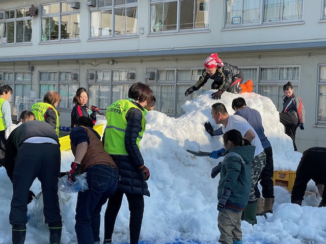 8時00分 林町小学校 校庭で雪のすべり台、カマクラ作り